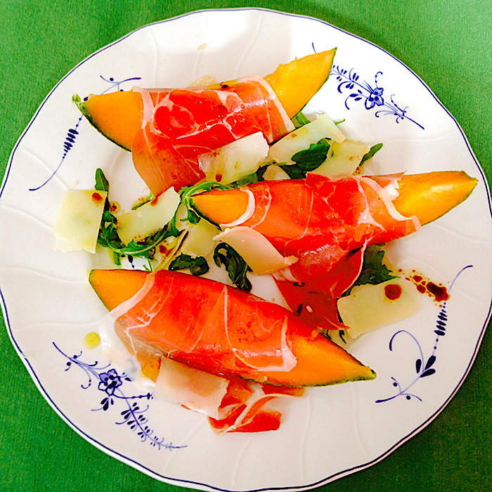 This melon, parmesan and prosciutto rocket salad could be served at any occasion starting as from late spring until the late summer months. Sunny sky, chilled white wine, lovely company in a secluded flower garden or near the edge of sparkling blue swimming pool, this is a dish to add joy no matter the mood or the setting.