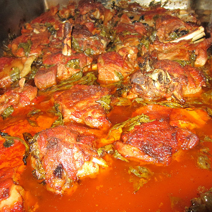 1. Start by preparing the marinate sauce for the meat. Mix in a deep bawl the oil, the tomato paste, the red and black pepper, plus the salt and the flour. Deep each piece of the meat in the marinate sauce and arrange on a flat oven tray for backing. Once all meat pieces have been dipped into the sauce, spread any remaining marinate pouring over the lamb. In-between each lamp piece tuck generously mint and lovage fresh leaves. Cover the tray with backing foil.